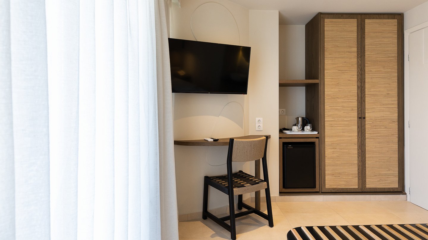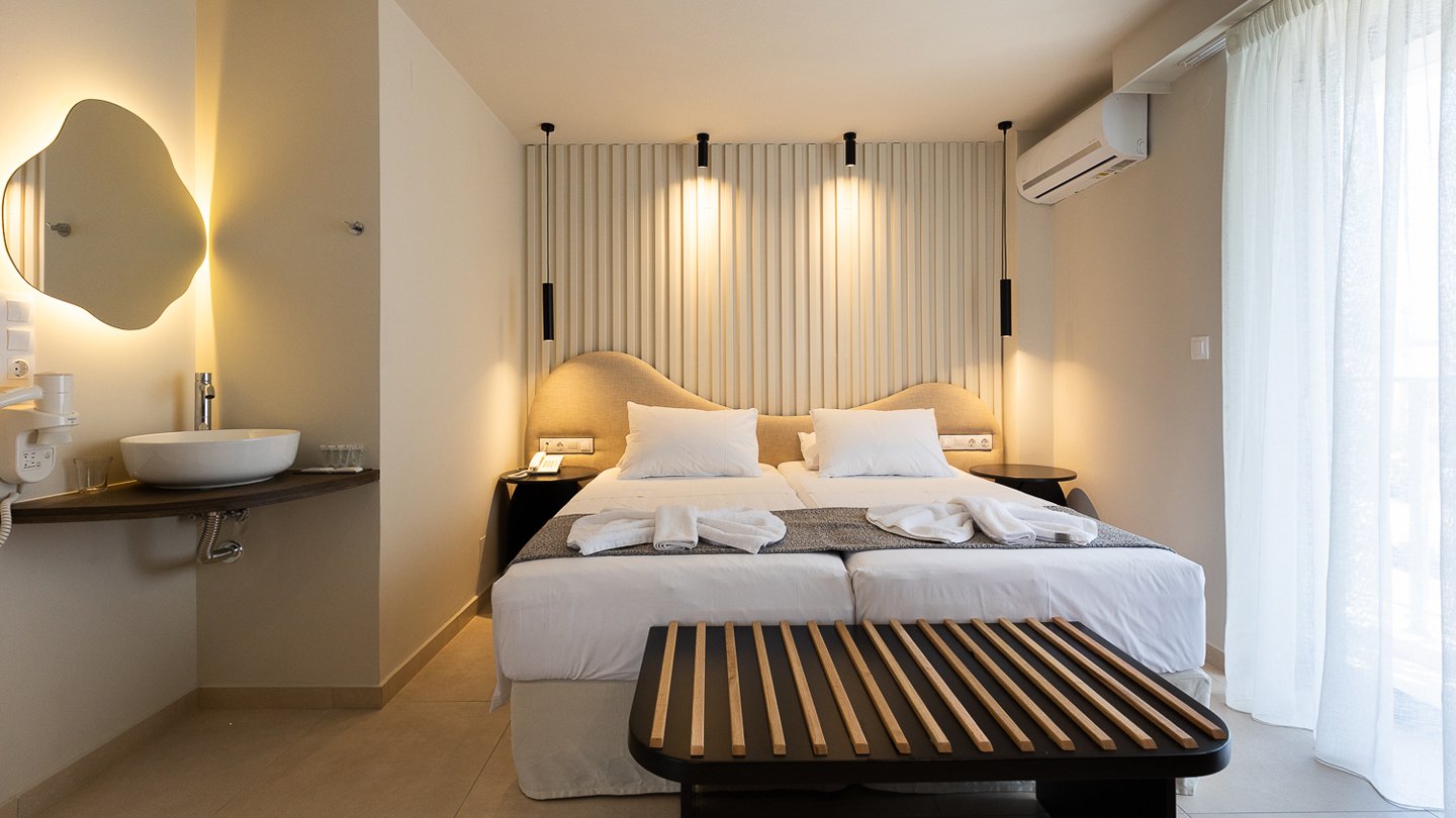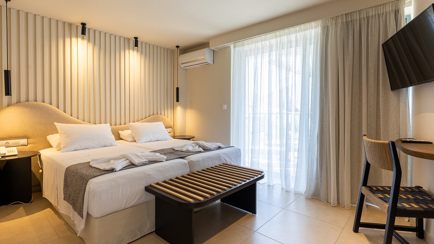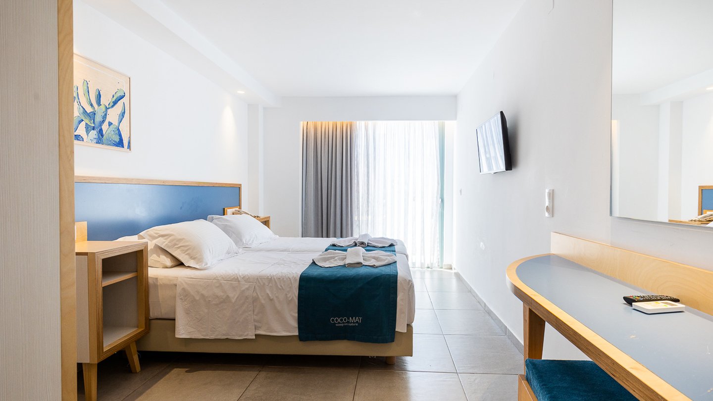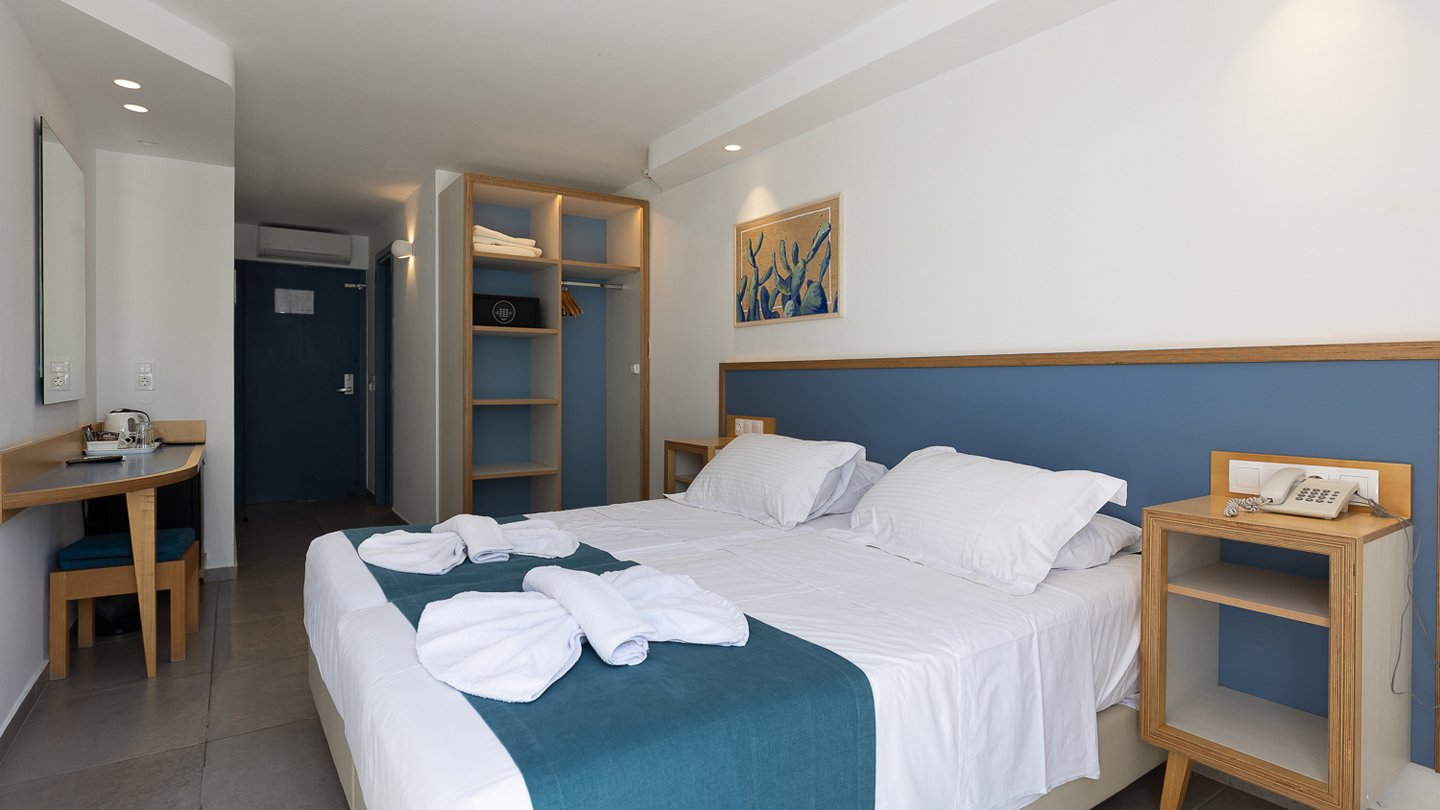Double Room Side Sea View – plašie numuri ar daļēju skatu uz jūru ir aprīkoti ar visām ērtībām, kas nepieciešamas patīkamai un komfortablai atpūtai. Daļējs skats uz jūru un balkons. Izmērs: 21 m2. Maksimālais viesu skaits numurā: 2.