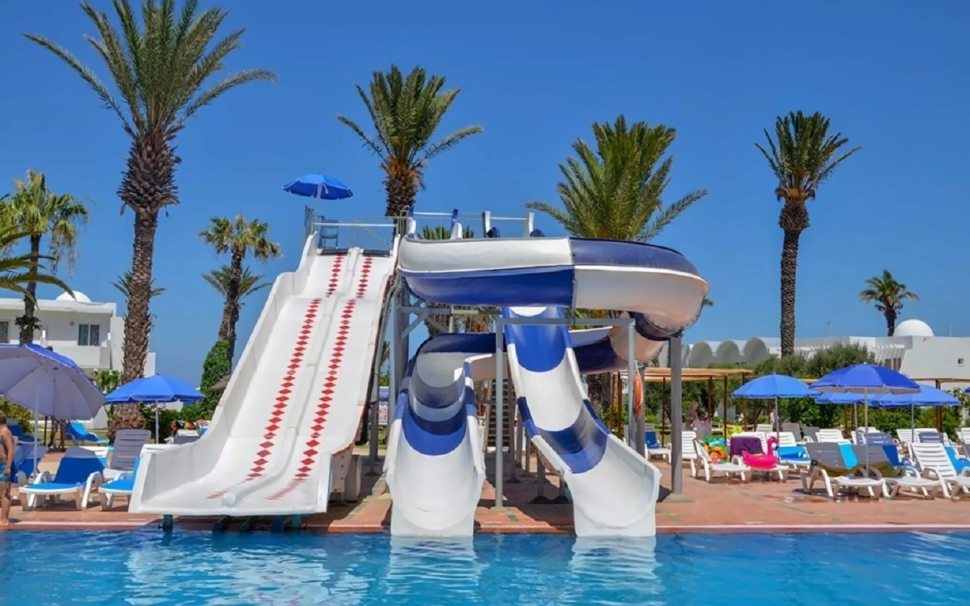 Sauļošanās krēsli un saulessargi pie baseina