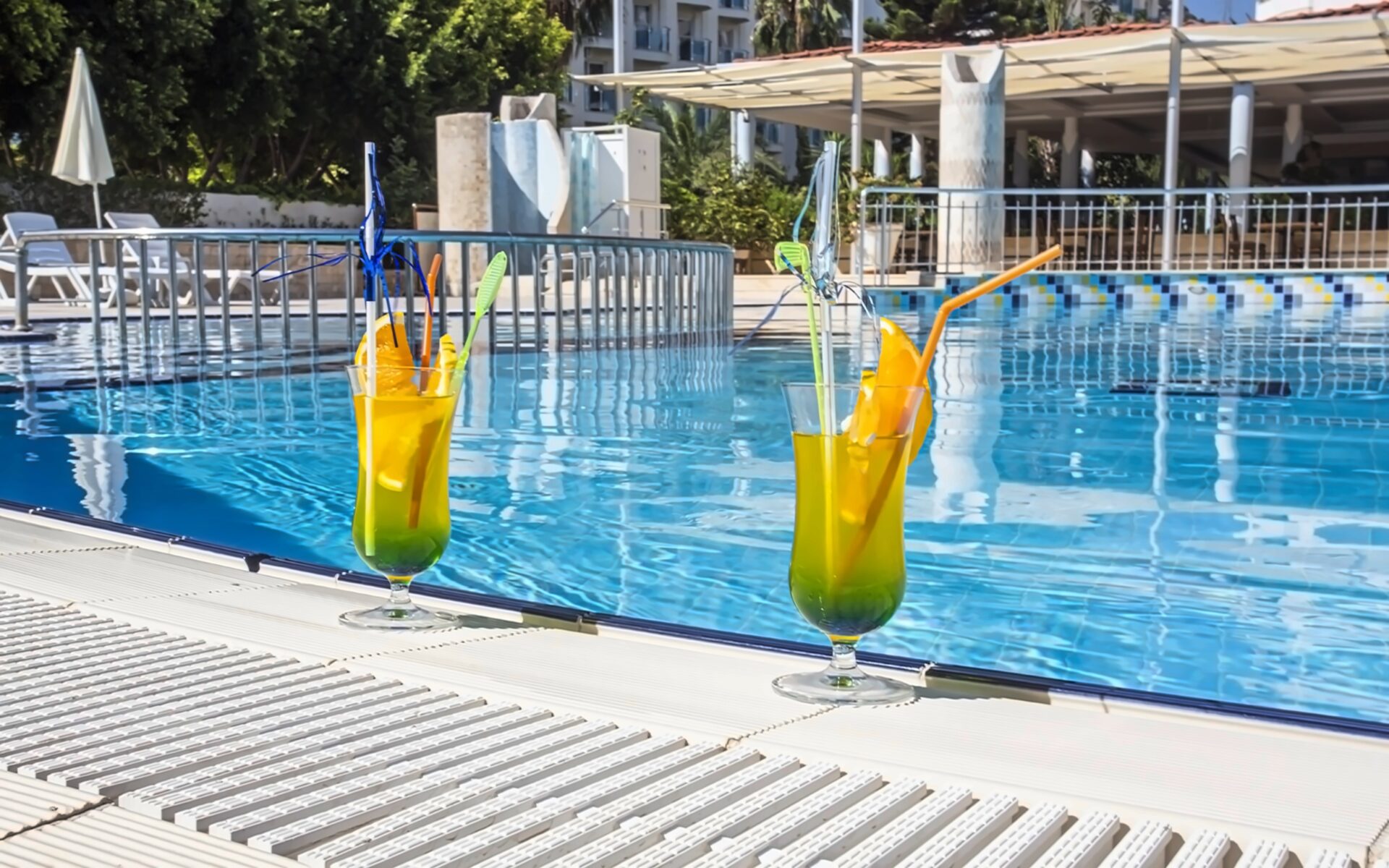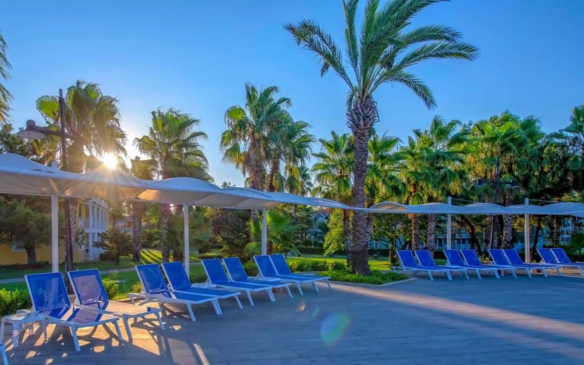 Bezmaksas saulessargi, sauļošanās krēsli un matrači pie baseina