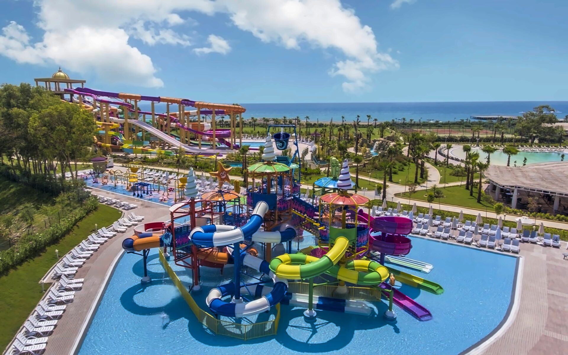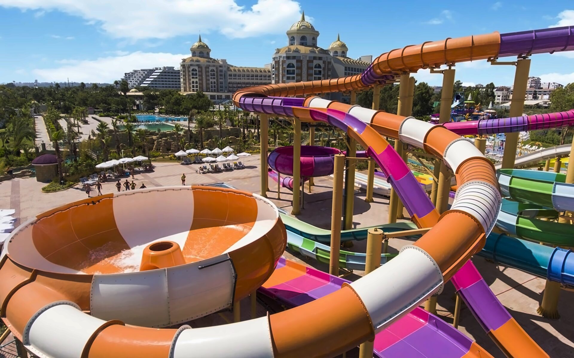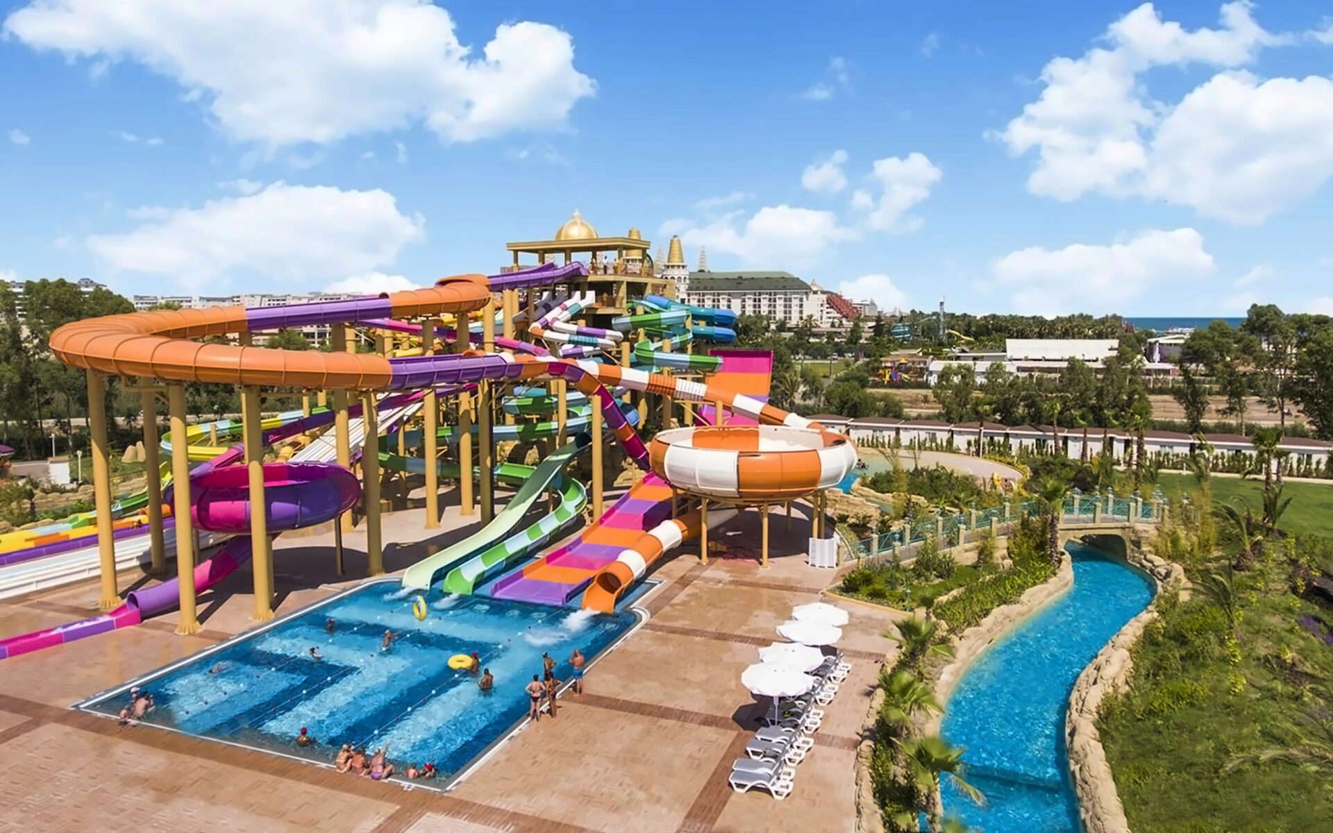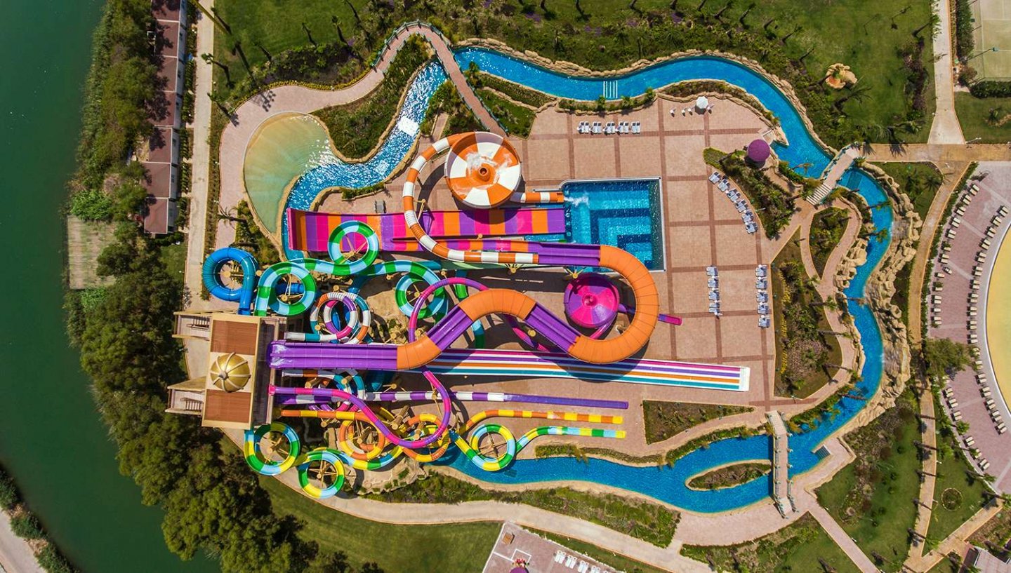 Akvaparks (9 ūdens slidkalniņi pieaugušajiem): dziļums 1,20 m, platība 323 m2