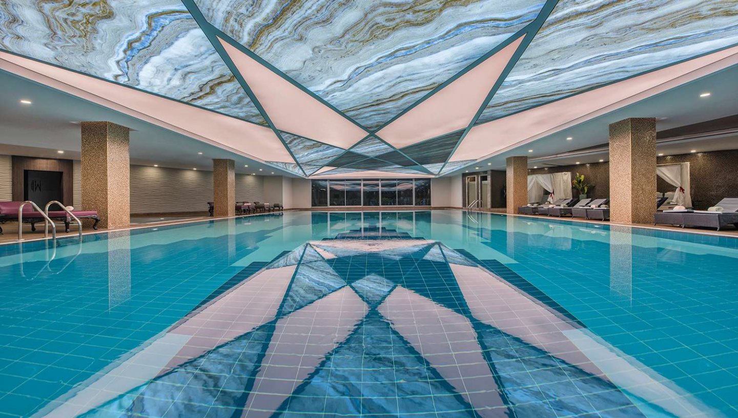 Iekštelpu baseins: dziļums 1,40 m, platība 312 m2
