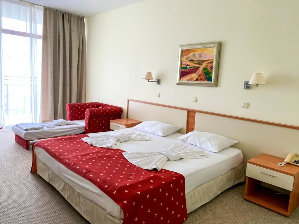 Helios Spa Hotel atrodas 450 metru attālumā no pludmales, senajā Zelta smilšu nacionālā parka mežā. Īpašumam ir āra baseins ar sauļošanās krēsliem un saulessargiem, SPA, trenažieru zāle, tvaika pirts un sauna. Viesnīcā ir restorāns, naktsklubs un baseina bārs. Starp viesiem pieejamajām izklaidēm ir daudzfunkcionāls futbola laukums, basketbols, volejbols, teniss, boča, galda teniss un biljards. Viesnīcas numuri ir aprīkoti ar gaisa kondicionētāju, privātu vannas istabu ar dušu un fēnu, balkonu un televizoru.