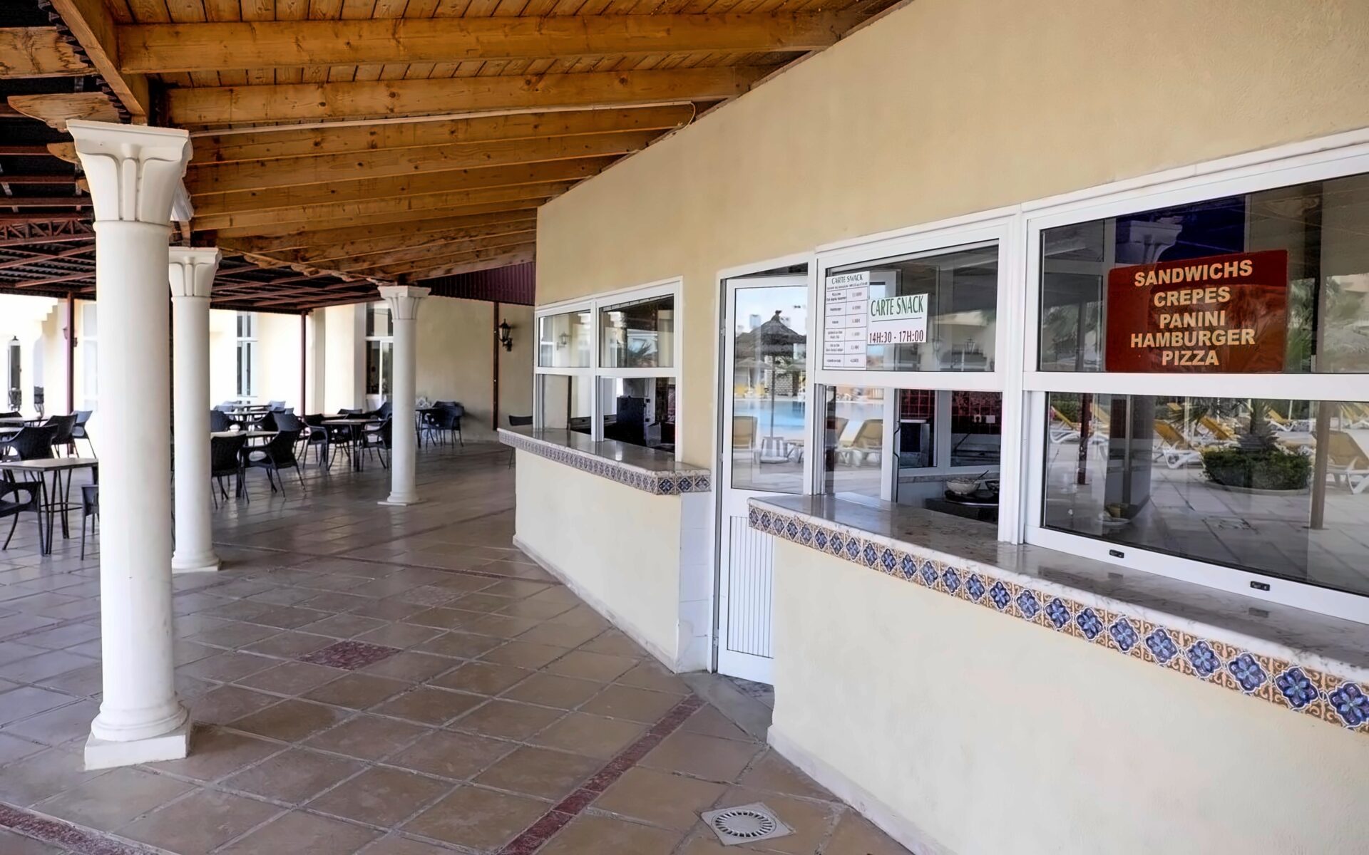 Snack restorāns pie baseina ar grilētiem ēdieniem un picām