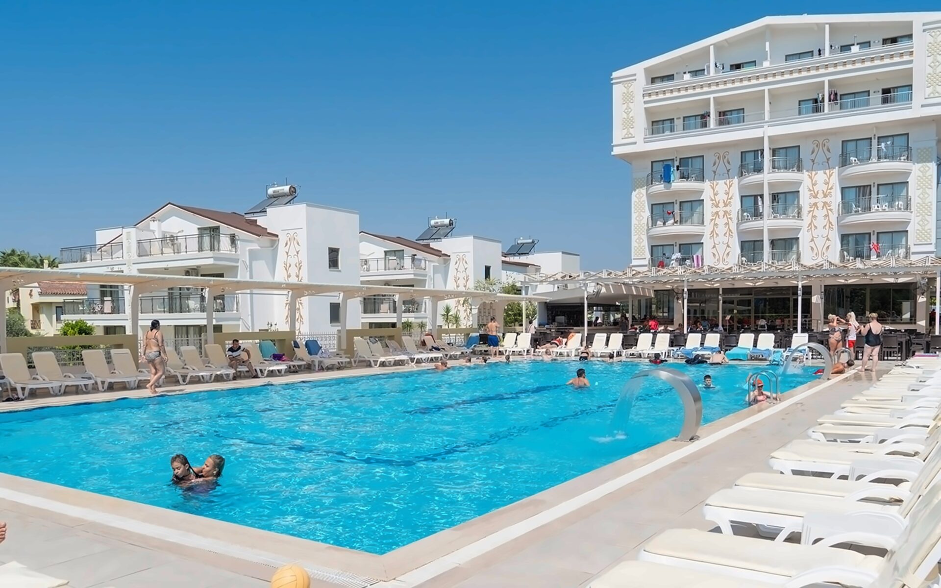 Bezmaksas sauļošanās krēsli, saulessargi un matrači pie baseina