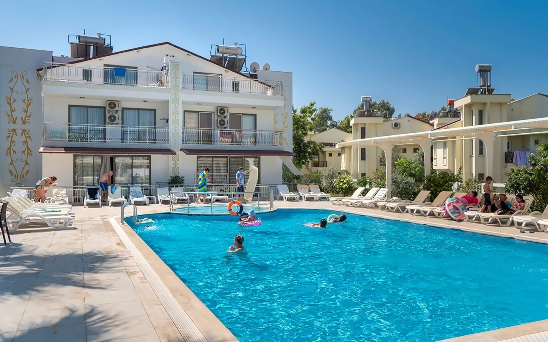 Villa Family Room – numura izmērs: 45 m2, atrodas trīsstāvu villās, divas guļamistabas ar durvīm, viena vannas istaba, maksimāli 4 personas, aprīkots ar visām ērtībām.