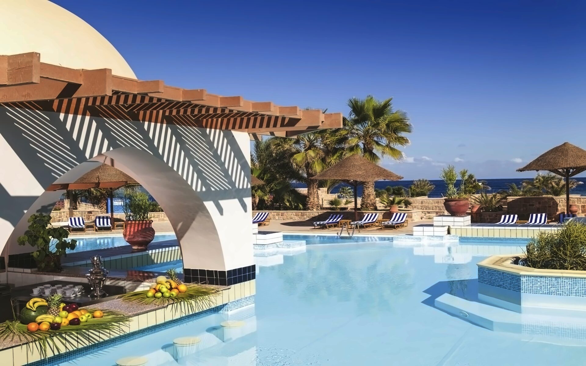 Sauļošanās krēsli, saulessargi un dvieļi pie baseina bez maksas