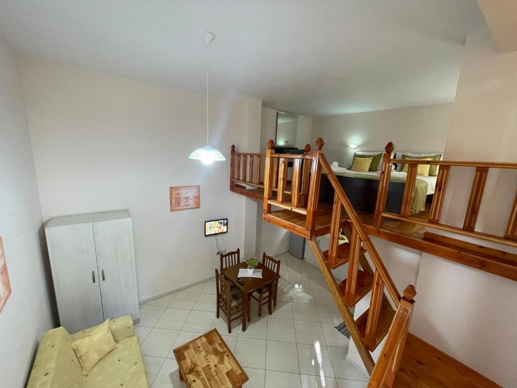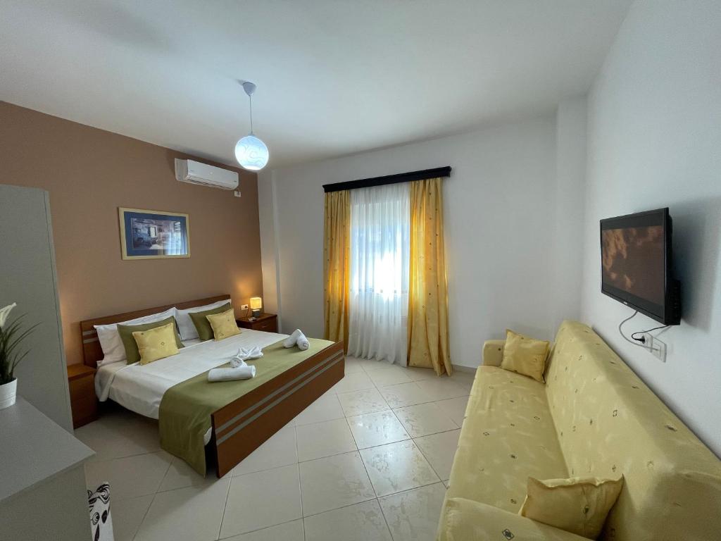 Apartments with Sea View – numura izmērs: 45 m2. Divistabu apartamenti ar skatu uz jūru, kas sadalīts guļamistabā ar vienu divguļamo gultu un vienu vienguļamo gultu un virtuvi-viesistabu ar dīvānu, ko var izmantot kā guļamvietu vienam pieaugušajam.