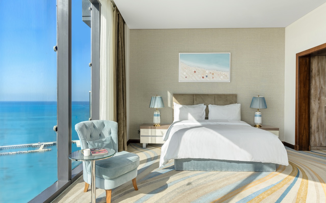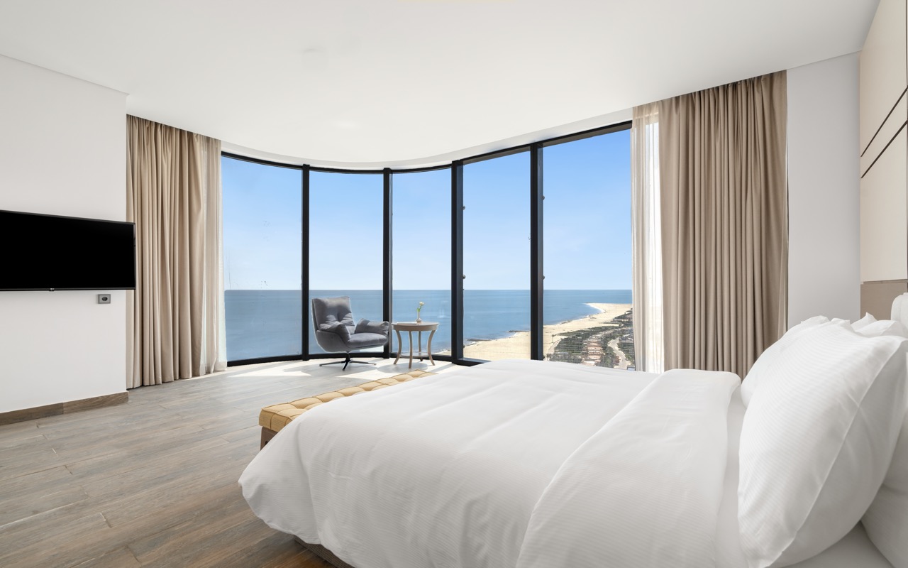 Premium Room Panoramic View – iekārtots vienistabas numurs ar divguļamo gultu. Papildu gulta – pārvietojama vienguļamā gulta. Lūdzu, ņemiet vērā, ka ir pieejama tikai viena papildu gulta (jāņem vērā, rezervējot 2+2 vai 3+1). Izbaudiet elpu aizraujošu skatu uz jūru vai lagūnu caur plašo panorāmas logu (nav balkona vai terases). Numura izmērs: 41 m2. Daudzums: 182. Maksimālais viesu skaits numurā (ieskaitot bērnus): 4.