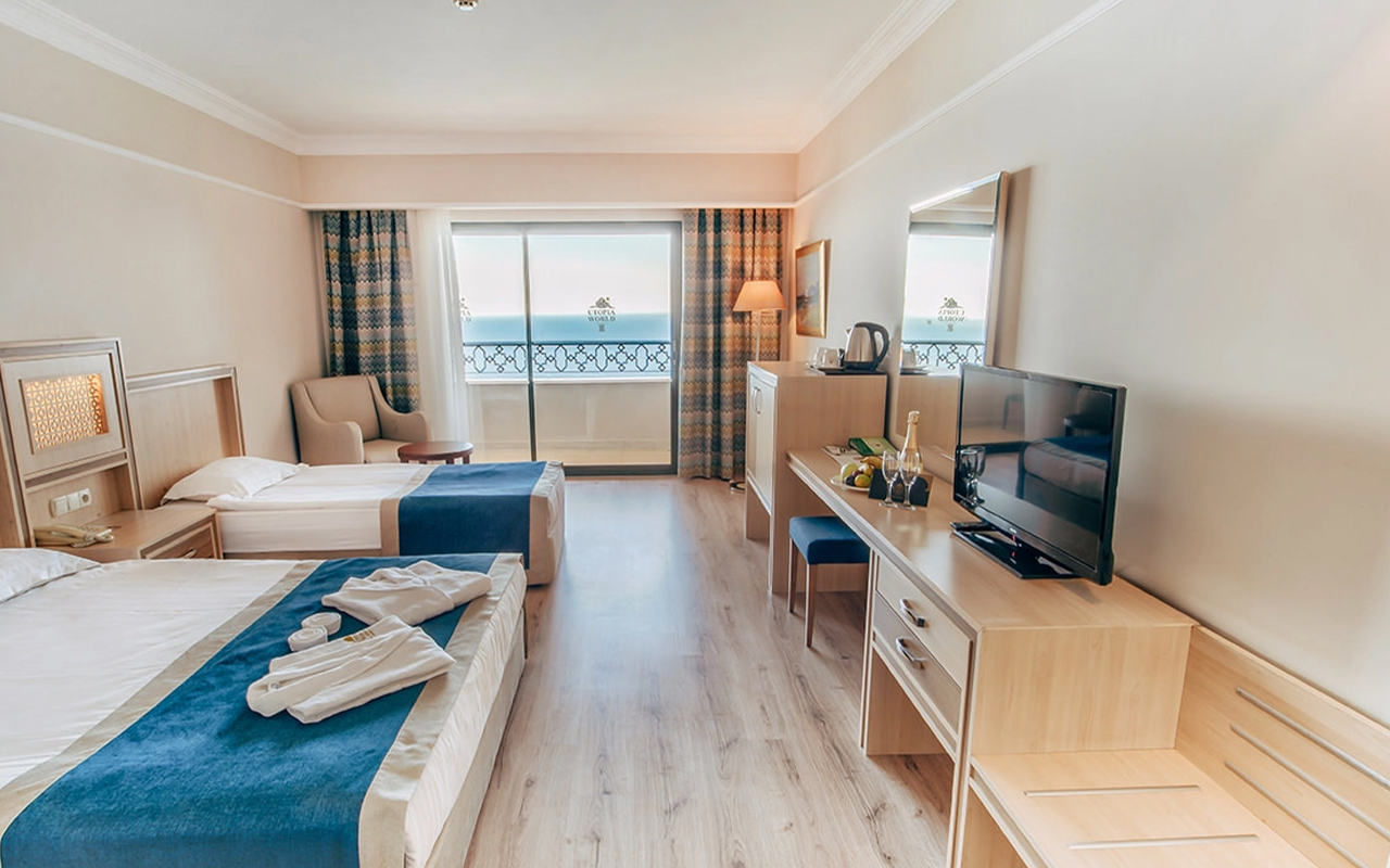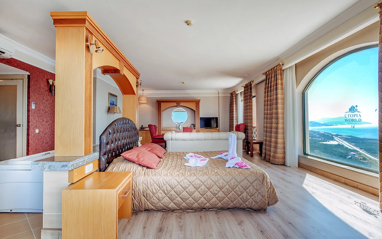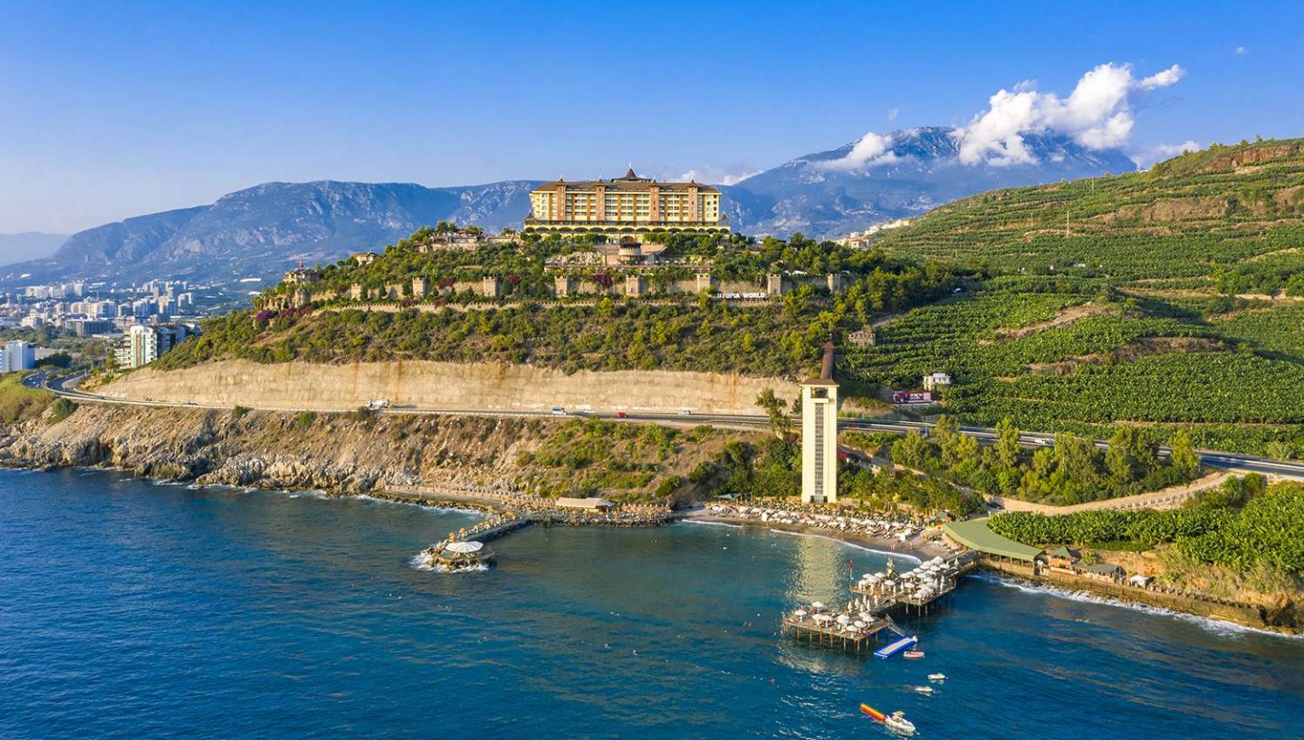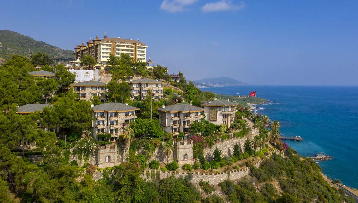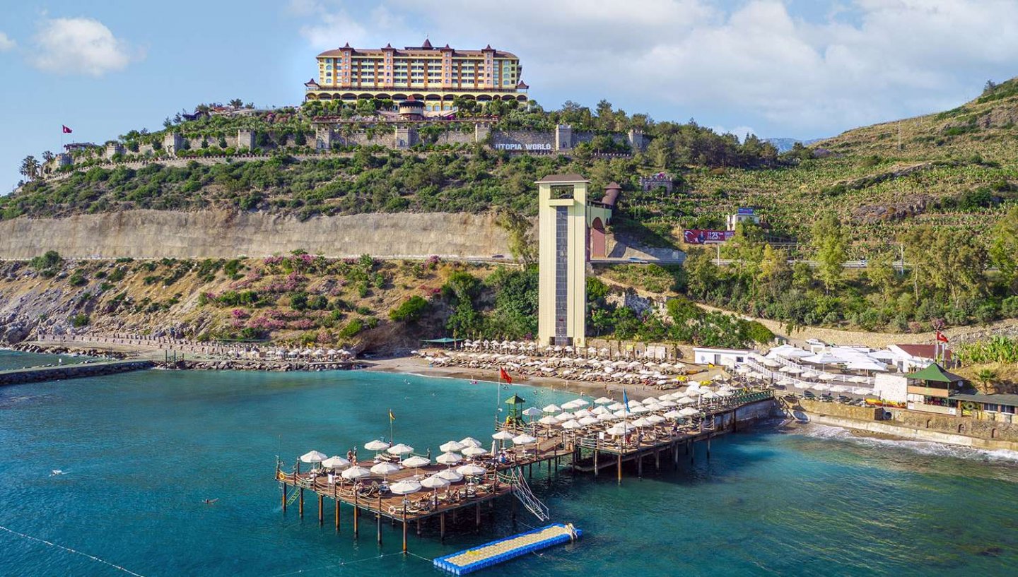 Viesnīca Utopia World atrodas uz klints Alanjas piekrastē, senās pilsētas Siedras vietā. No logiem paveras skats uz Vidusjūru. Viesnīca piedāvā Zilā karoga privāto pludmali ar 2 piestātnēm, āra baseiniem, ūdens atrakciju parku un SPA ar tradicionālo hamamu, kā arī vairākus a la carte restorānus. Viesnīca ir piemērota ģimenēm ar bērniem.