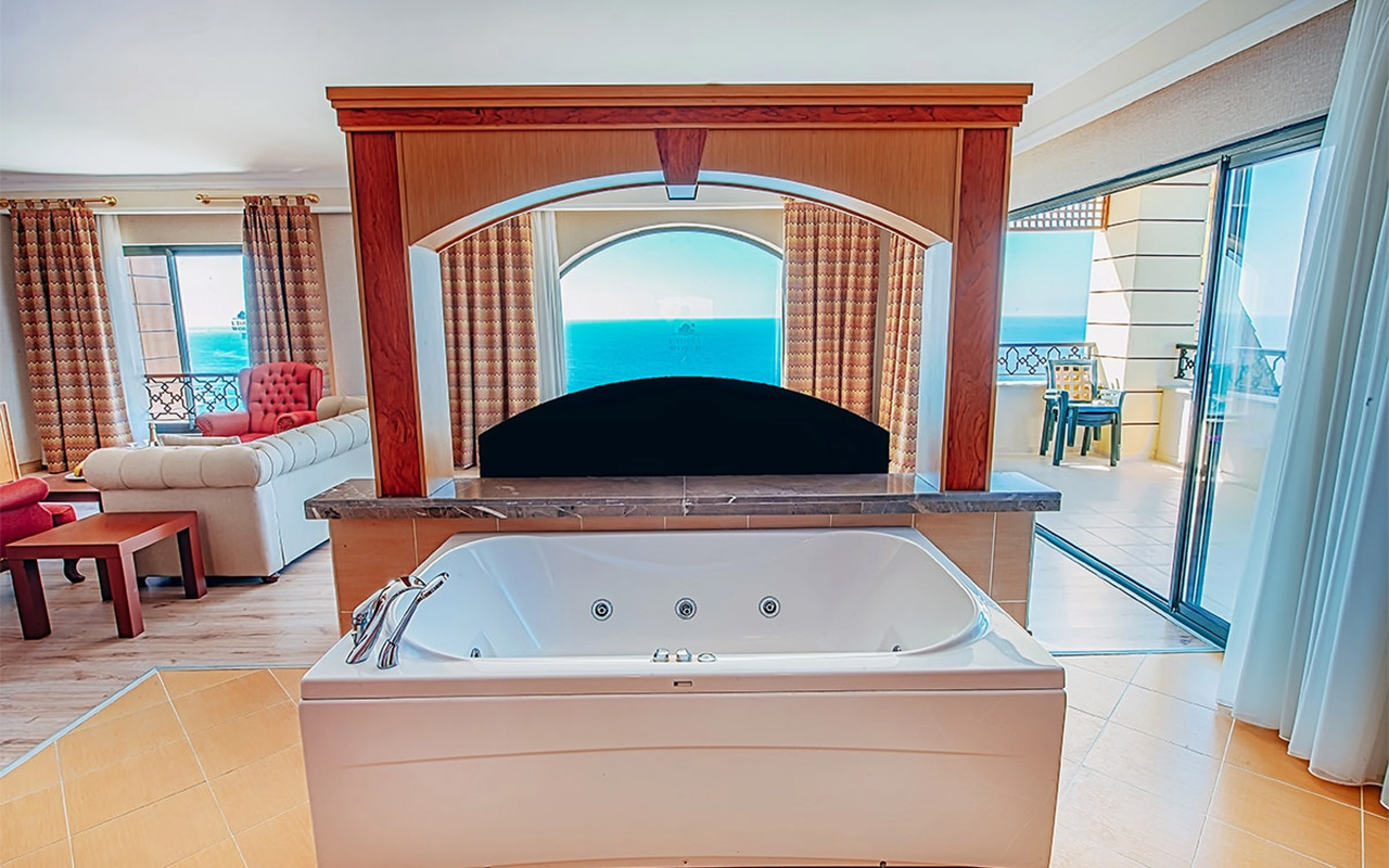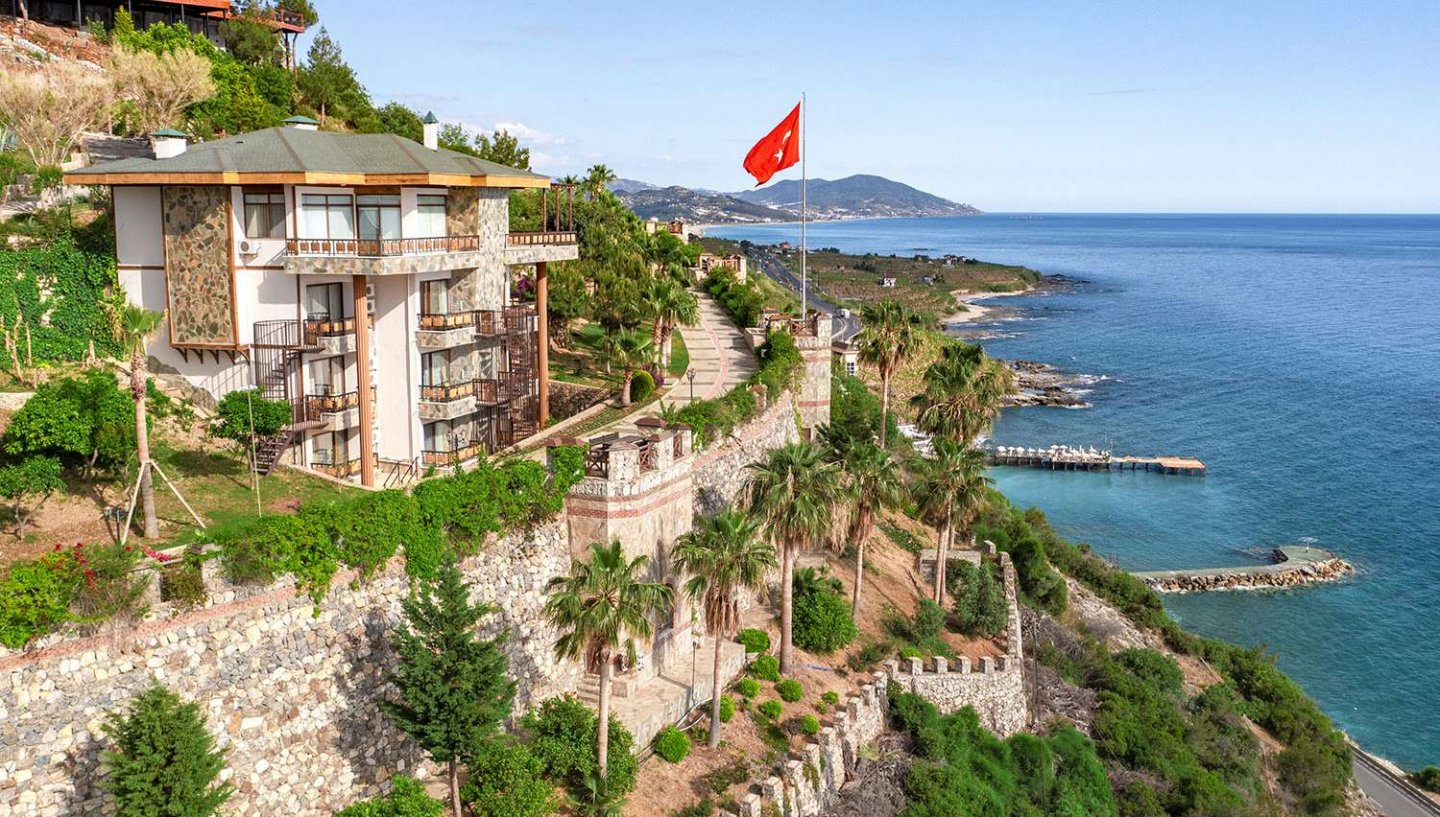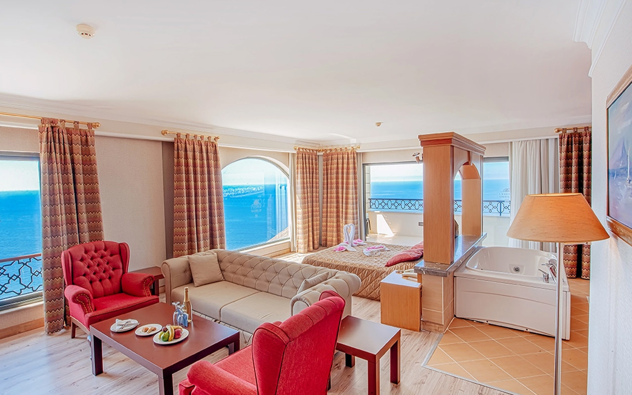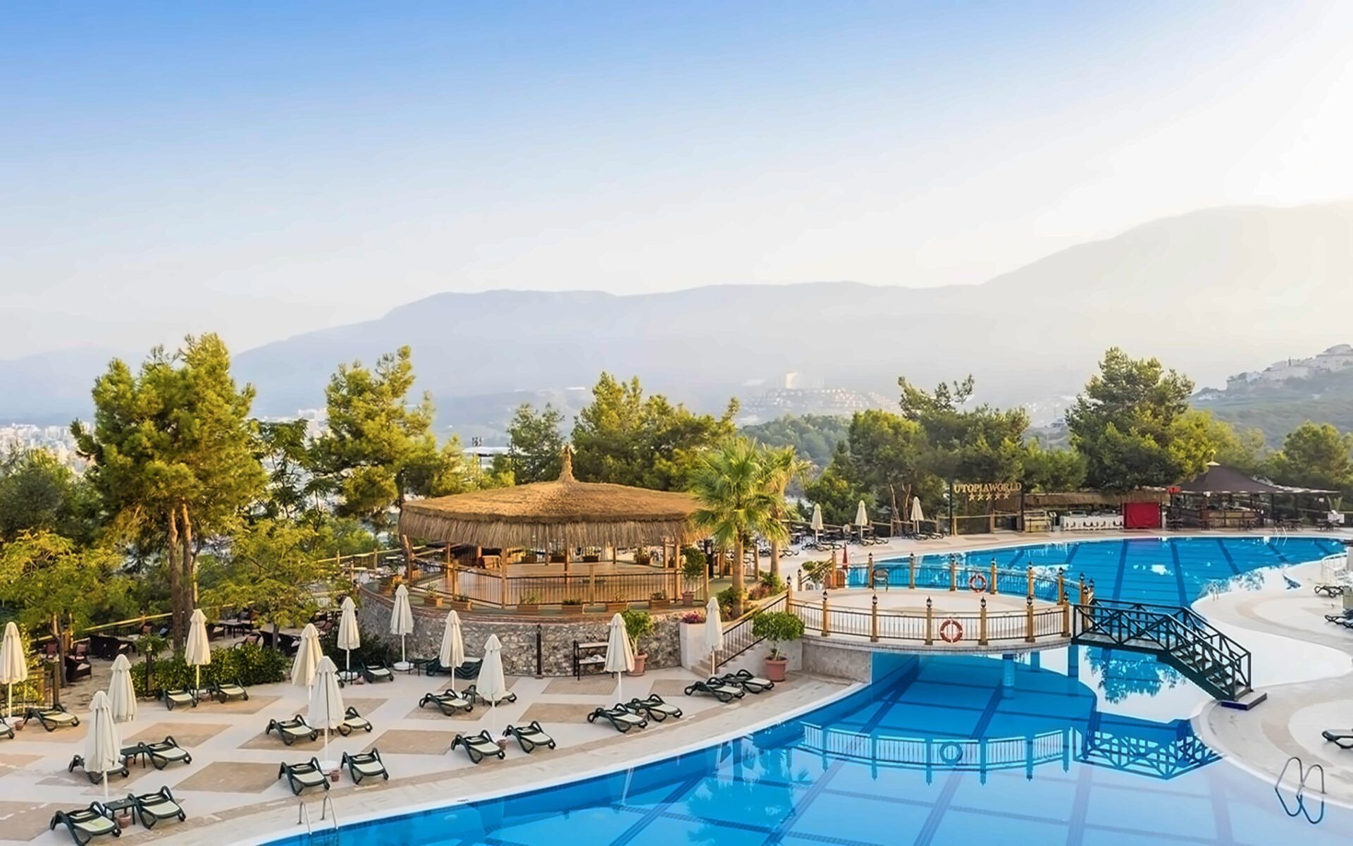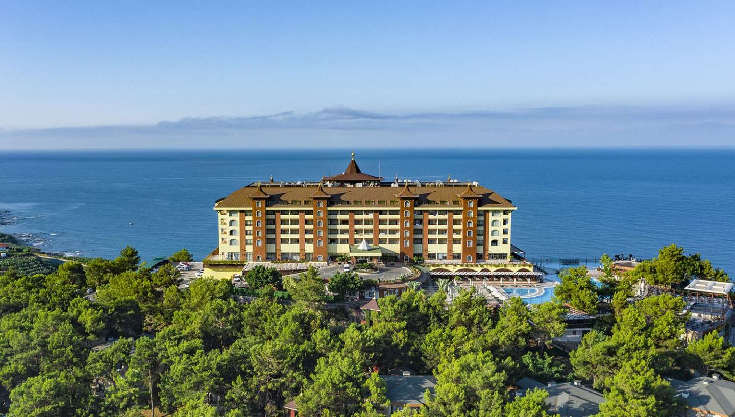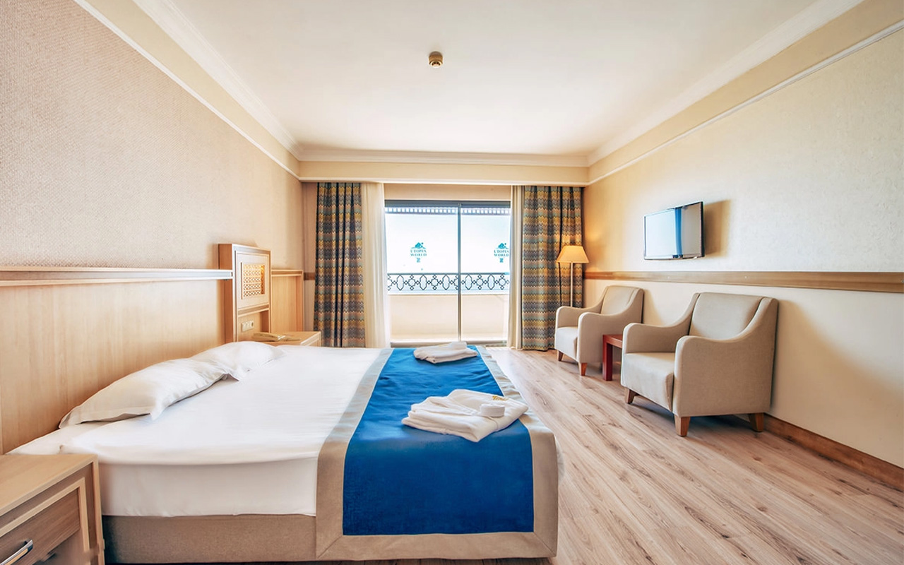 Viesnīca Utopia World atrodas uz klints Alanjas piekrastē, senās pilsētas Siedras vietā. No logiem paveras skats uz Vidusjūru. Viesnīca piedāvā Zilā karoga privāto pludmali ar 2 piestātnēm, āra baseiniem, ūdens atrakciju parku un SPA ar tradicionālo hamamu, kā arī vairākus a la carte restorānus. Viesnīca ir piemērota ģimenēm ar bērniem.