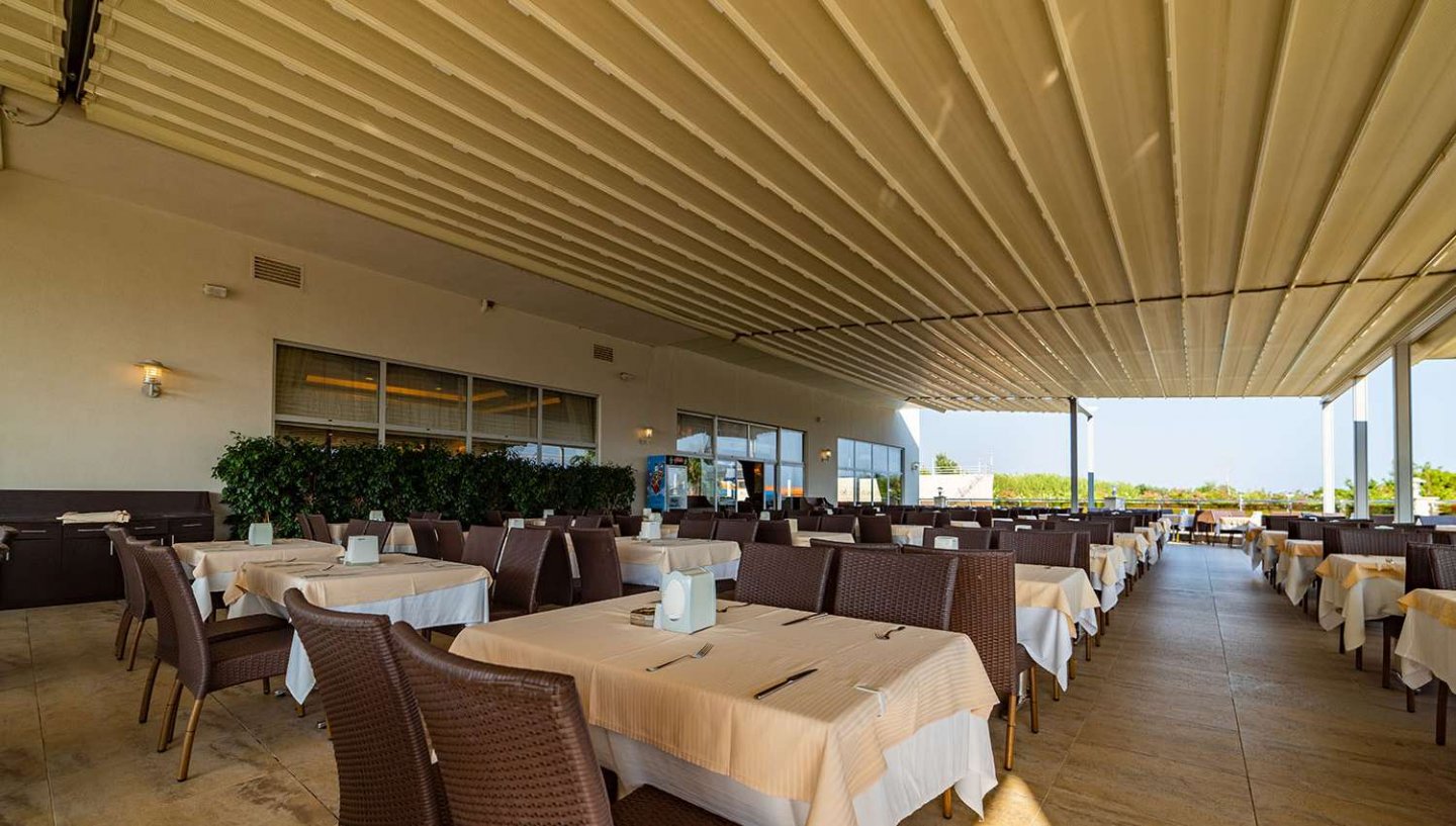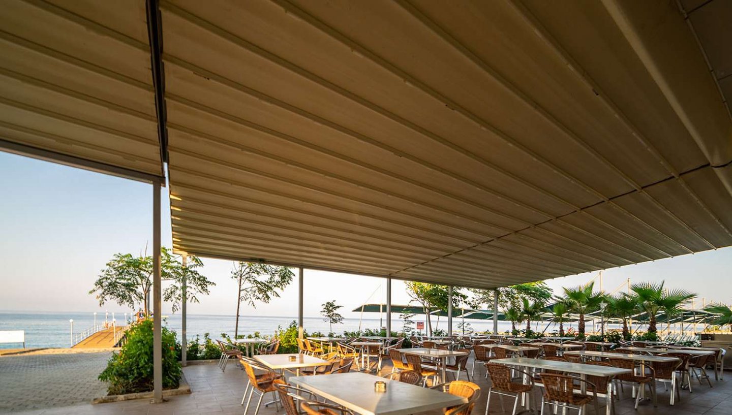 2 galvenie restorāni – 700 cilvēkiem paredzētās segtās sekcijas, atvērtas terases 400 un 200 cilvēkiem