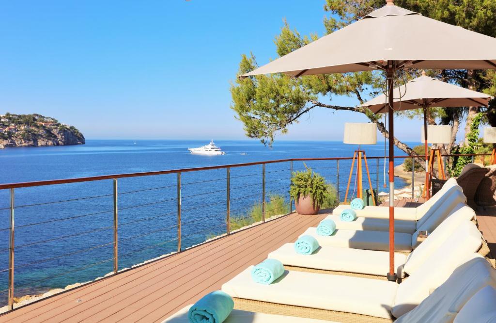 Шезлонги на пляже (на бетонной платформе у скалистого пляжа)
