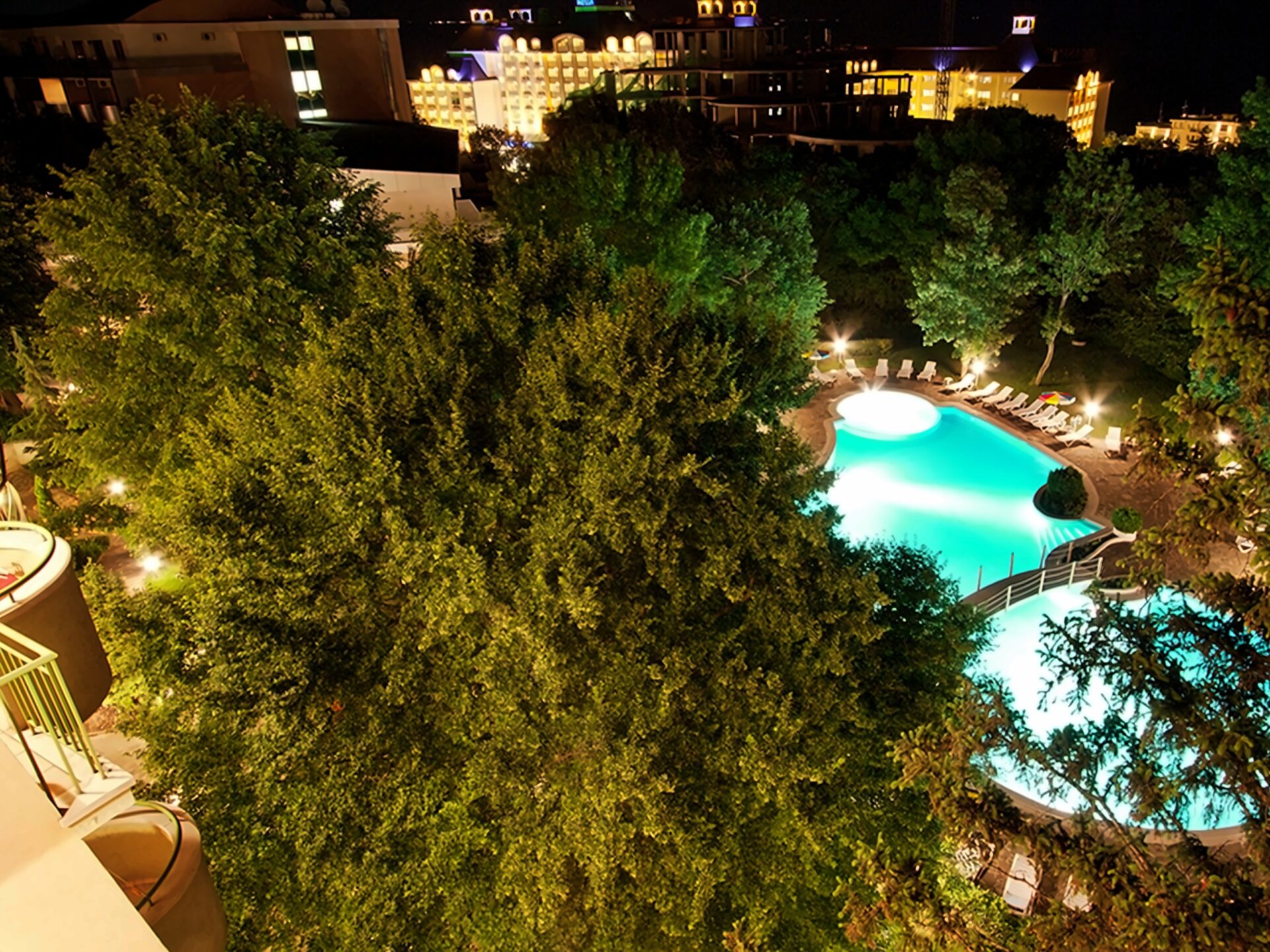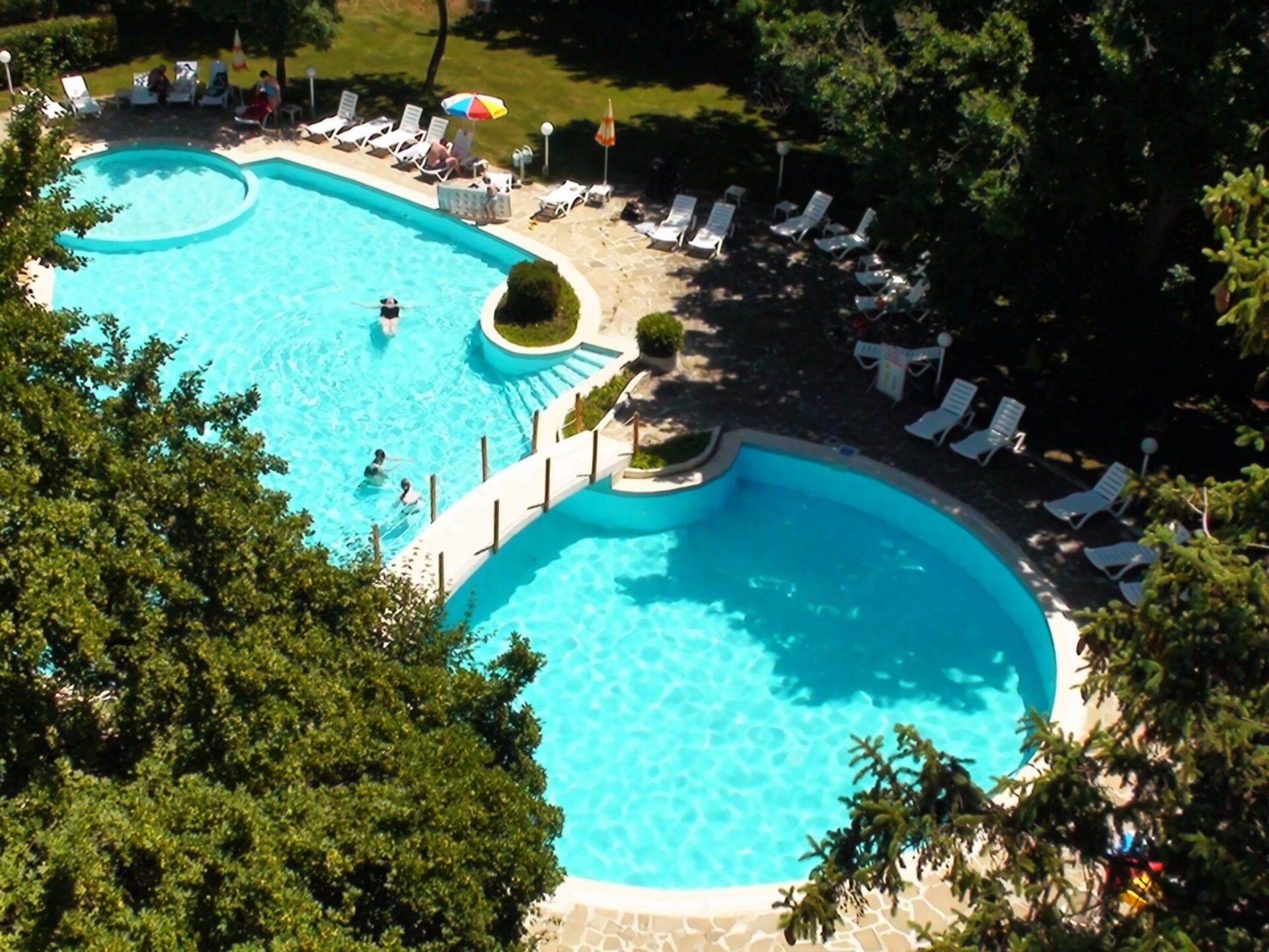 Большой открытый бассейн с зонтами и баром