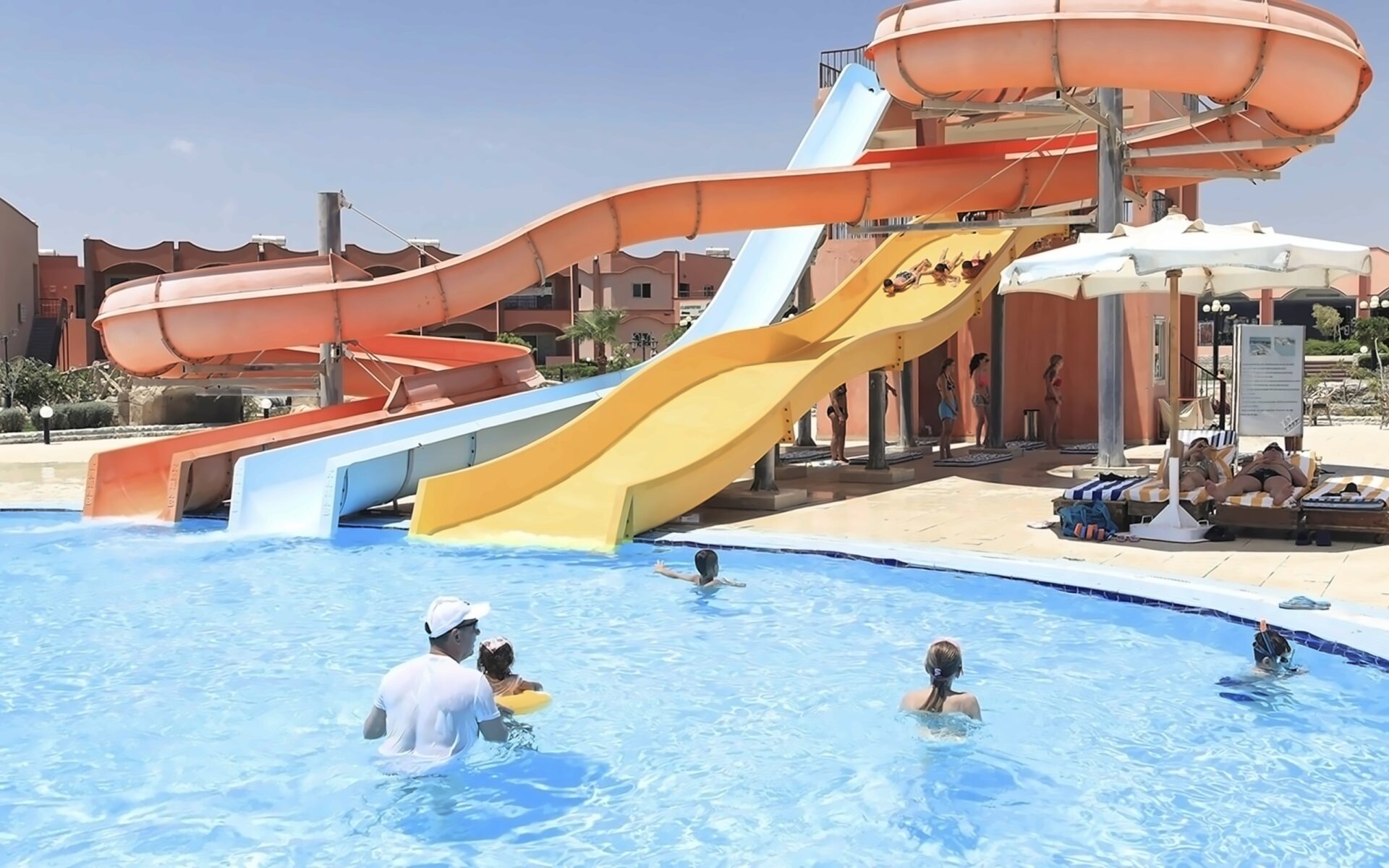 Разнообразные водные аттракционы: бассейны, водные горки, lazy river